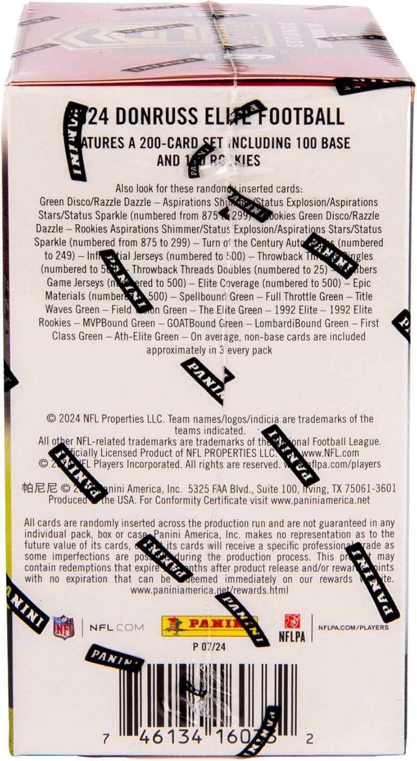 The fabled Donruss Elite Football franchise returns for the 2024 NFL season locked and loaded with a 200-card base set, featuring a captivating base aesthetic and 100 Rookie Cards, paralleled by the venerable Aspirations and Status chases. Find 1 Blaster Exclusive Aspirations Shimmer or Status Explosion! Look for Blaster Exclusive Green Disco Parallels!