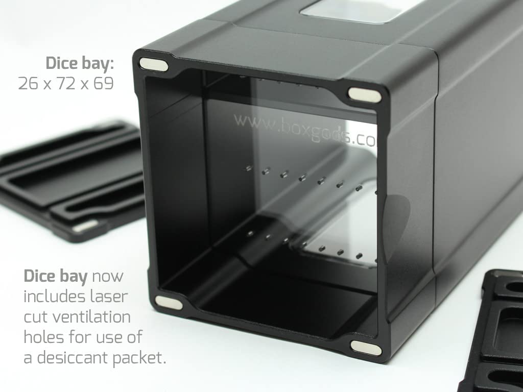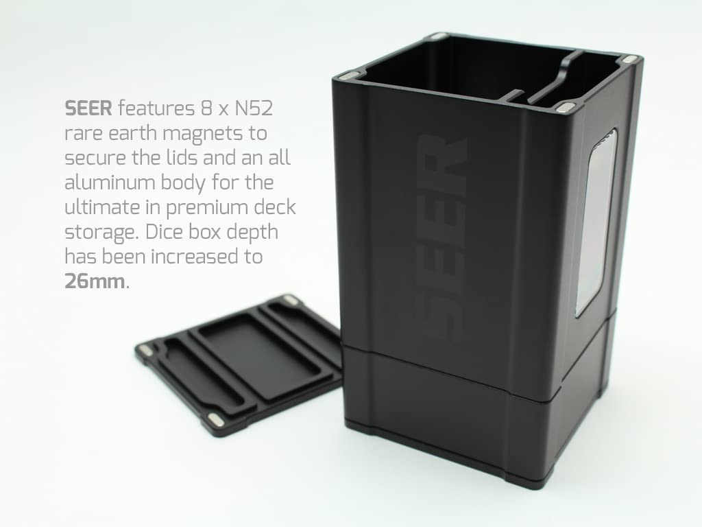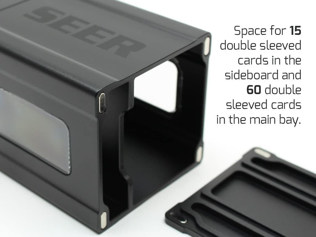 Designed and built from the ground up for serious gamers who demand serious protection for their most valuable decks. Featuring an aerospace grade machined aluminum chassis, dual four port magnetic covers, and two acrylic viewports for showing off your favorite cards. The three compartment design has room for 70 sleeved cards in the primary bay and space for an additional 30 cards in the secondary bay. The "basement" is perfect for ancillary items like dice.