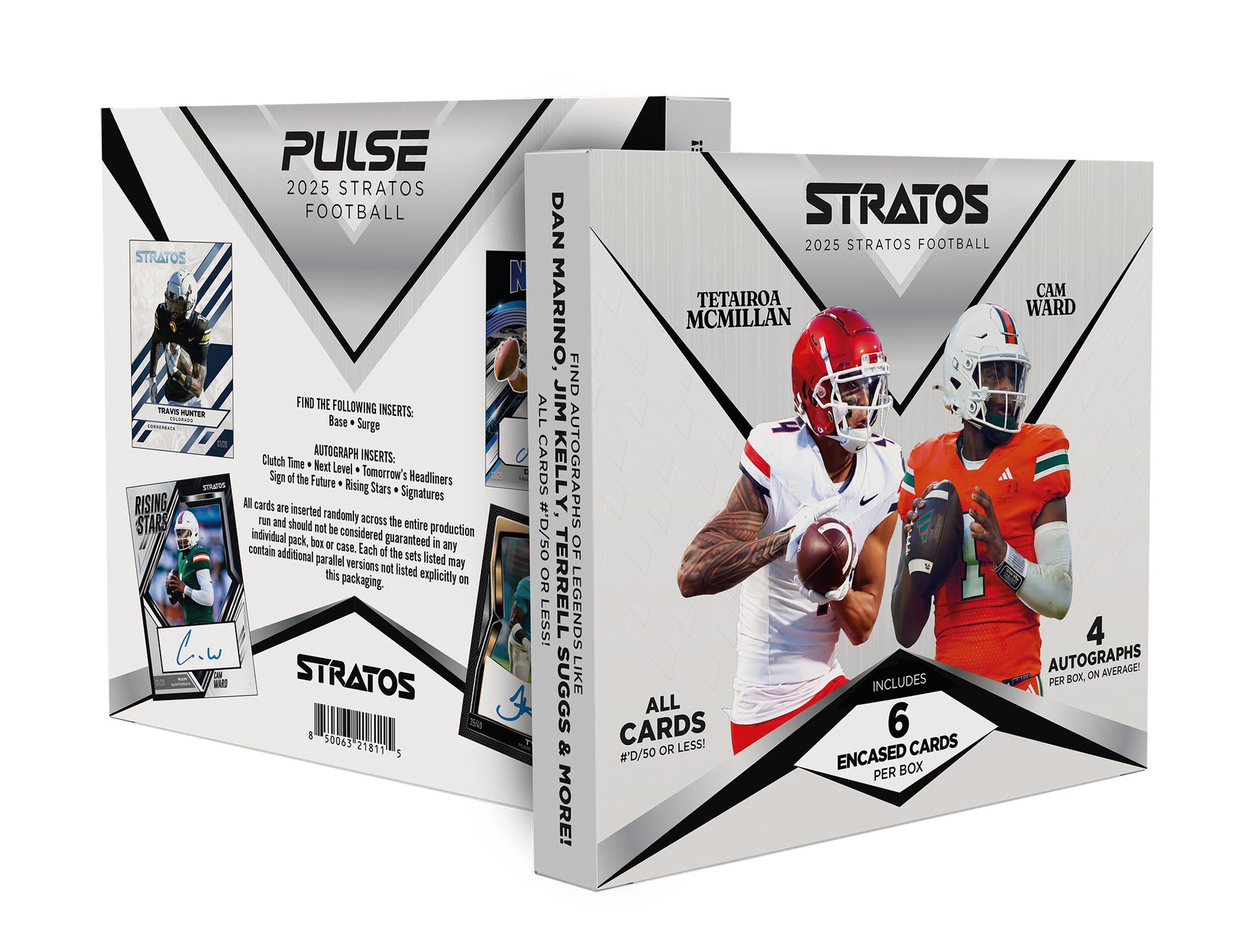 The 2025 Pulse Stratos Football series highlights the nation’s top college football stars as well legendary pros. Includes Football Rookies like Cam Ward, Travis Hunter and Tetairoa McMillian. Each card is #'d to 50 or less and is delivered in a jewel case. This is the perfect set for any football collector.