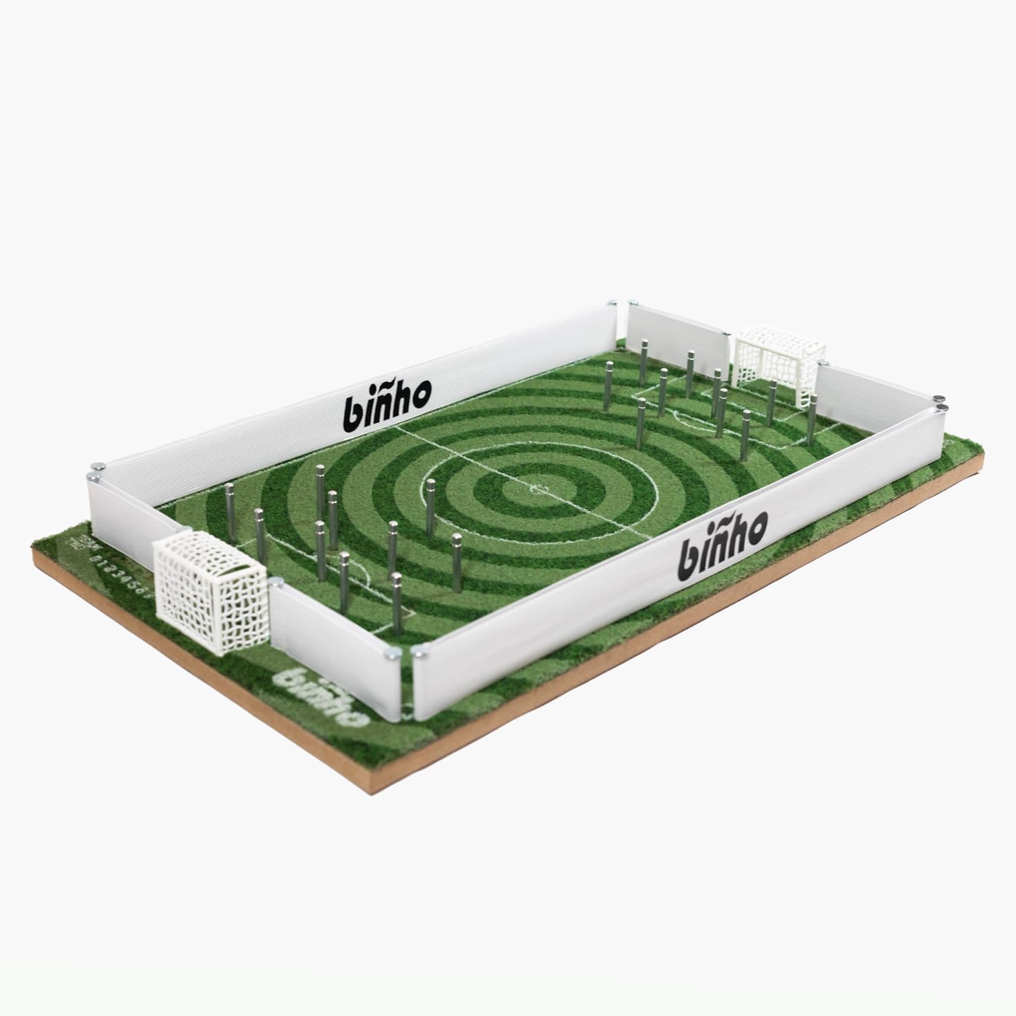 Complete Set - Create memorable moments with our Binho Board Circle Stripes Edition. Each set comes with everything you need: 22” x 13” x 3” Binho board, 2 balls, 2 score pins, 2 red/yellow cards, 2 white goals, 20 aluminum metal removable player pieces, 12 barrier pieces, 6 white exterior elastic bands (2 long, 4 short), 1 rules pamphlet, and 1 drawstring bag.