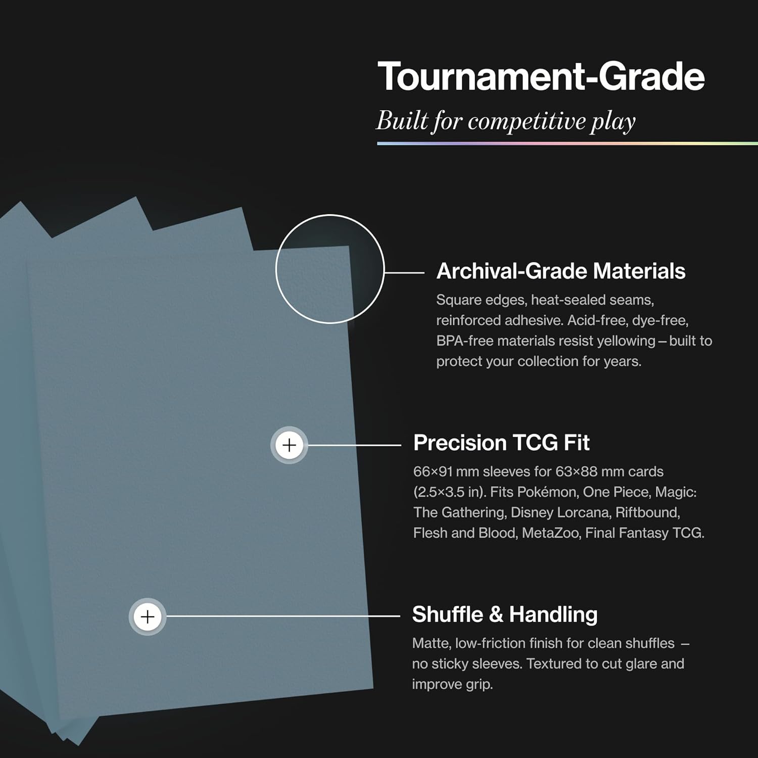 COMPETITION-GRADE MATERIALS Created by design professionals and competitive TCG players, Curator sleeves are ready for the biggest stages. Crystal-clear fronts, glare-resistant matte backs, reduced clouding, the right feel in your hands, smooth shuffling. They just feel ... superior.