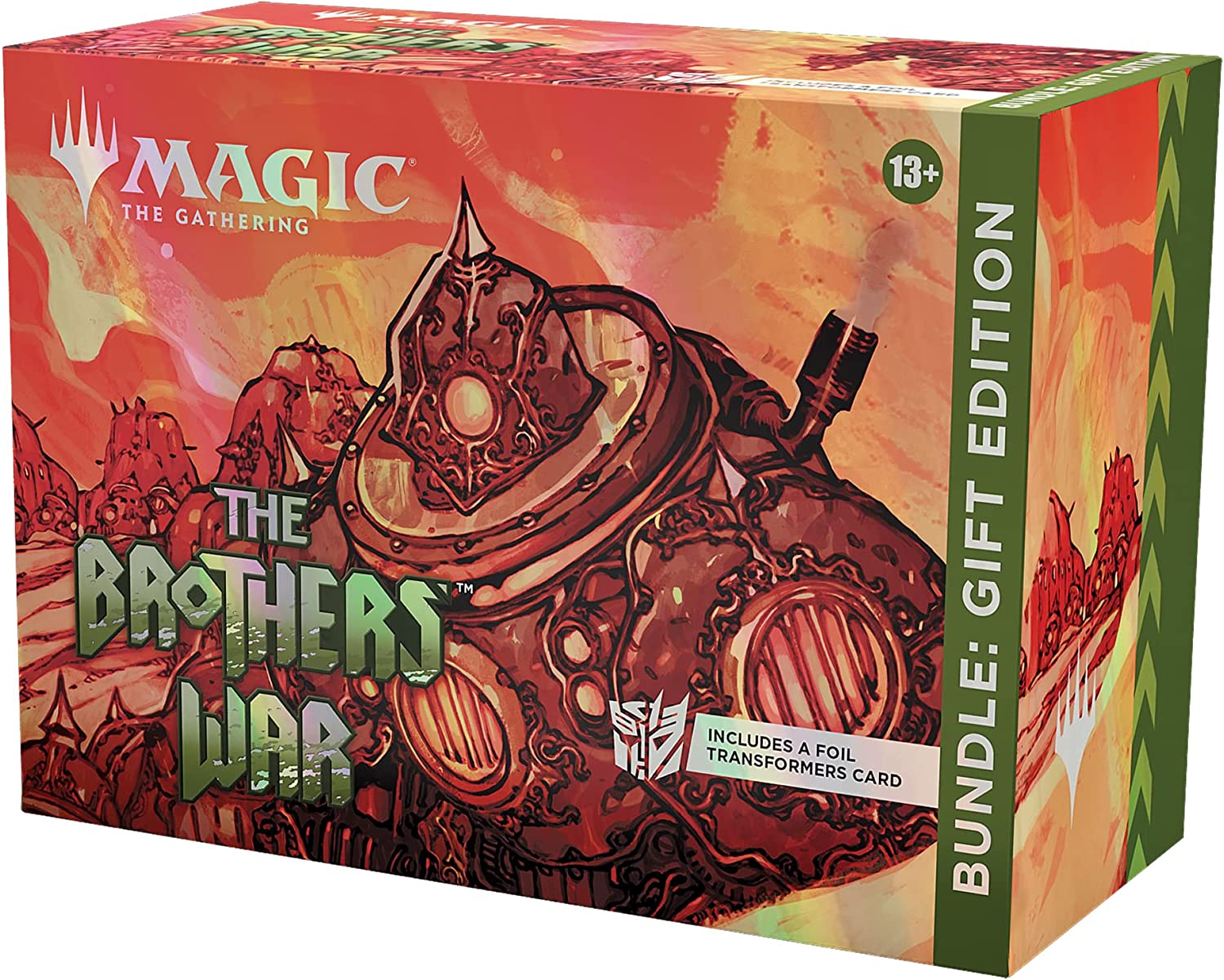 Celebrate The Brothers' War with a deluxe bundle full of exclusive accessories and cards that will transport fans back to beloved styles and storylines from 1990s Magic. On top of the usual Bundle goodies, the Gift Bundle contains a 15-card Collector Booster, including cards with special card treatments, 10–11 shining foil cards, and a total of 6 cards of rarity Rare or higher. It’s the perfect gift for the ultimate Magic fan in your life, especially if that fan is you.The Gift Bundle also contains 1 Traditional Foil Transformers Mythic Rare card, 8 The Brothers’ War Set Boosters, 40 basic lands (20 traditional foils and 20 nonfoils), 1 traditional foil alternate-art promo card, 1 exclusive oversized Spindown life counter, 1 special Gift Edition foil card storage box, and 2 reference cards.Each The Brothers’ War Set Booster contains 12 Magic cards, 1 Art Card, and 1 token/ad card or card from “The List” (a special card from Magic's history), with a combination of 1–5 card(s) of rarity Rare or higher and 3–7 Uncommon, 3–6 Common, and 1 Land cards.