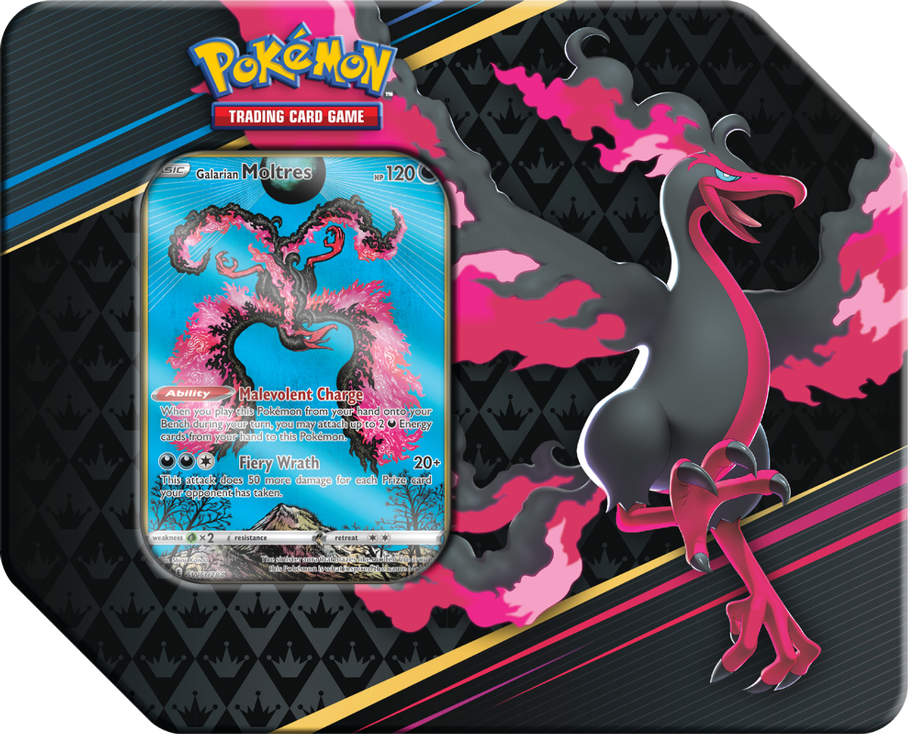 Three fearsome Legendary Pokémon have arrived from the Galar region! With their own unique type and powers, they’re forces to be reckoned with. Add this power to your Pokémon TCG collection and see for yourself! Will you choose the atrocious attitude of Galarian Articuno, the zippy zeal of Galarian Zapdos, or the malevolent malice of Galarian Moltres? Regardless of your choice, you’ll also find 5 booster packs from the special Pokémon TCG: Crown Zenith expansion and a code card for Pokémon TCG Live!