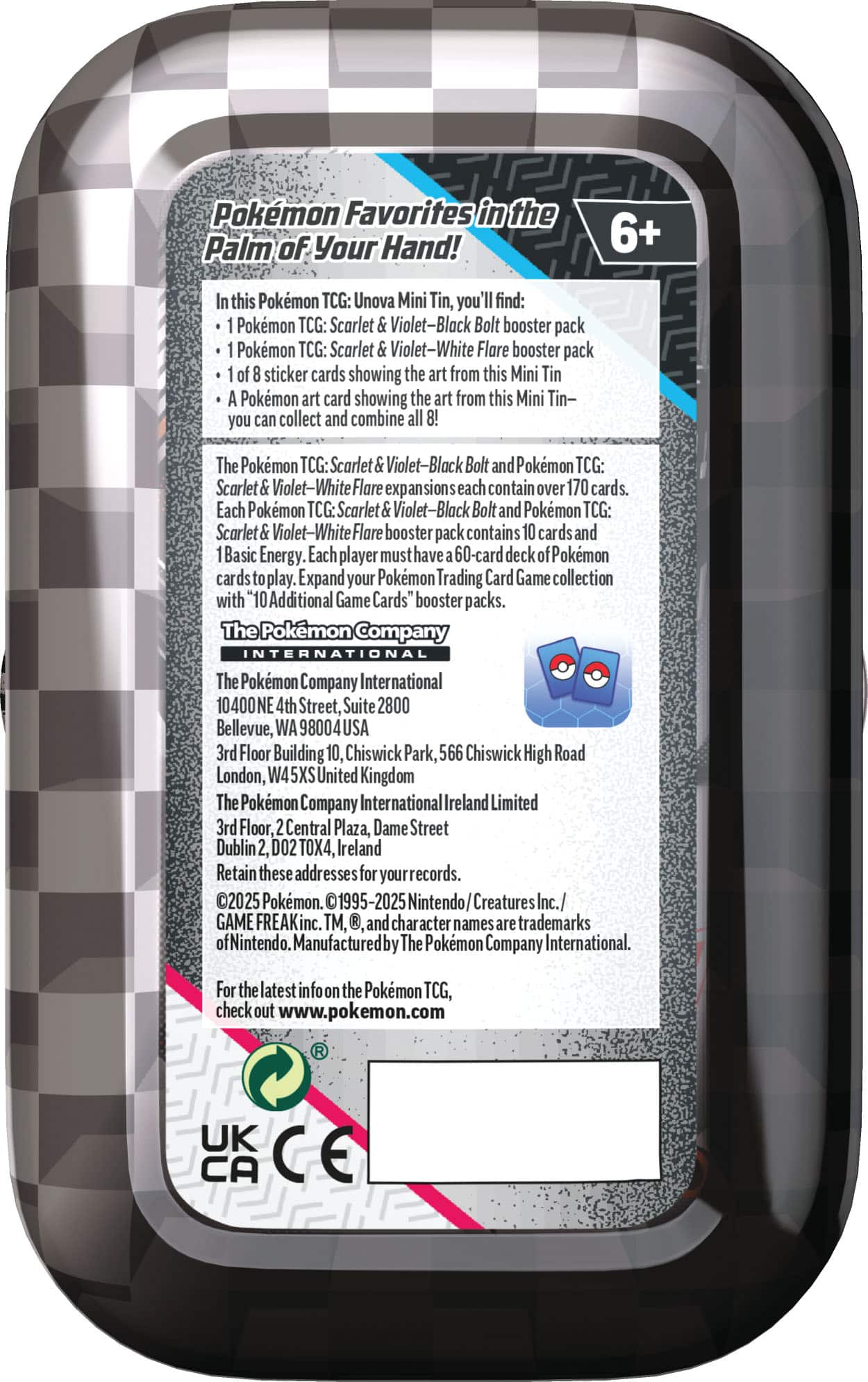 Pokemon Favorites in the Palm of Your Hand! In this Pokemon TCG: Unova Mini Tin, you'll find: 1 Pokemon TCG: Scarlet & Violet Black Bolt booster pack, 1 Pokemon TCG: Scarlet & Violet White Flare booster pack, 1 of 8 sticker cards showing the art from this Mini Tin, and A Pokemon art card showing the art from this Mini Tin- you can collect and combine all 8!