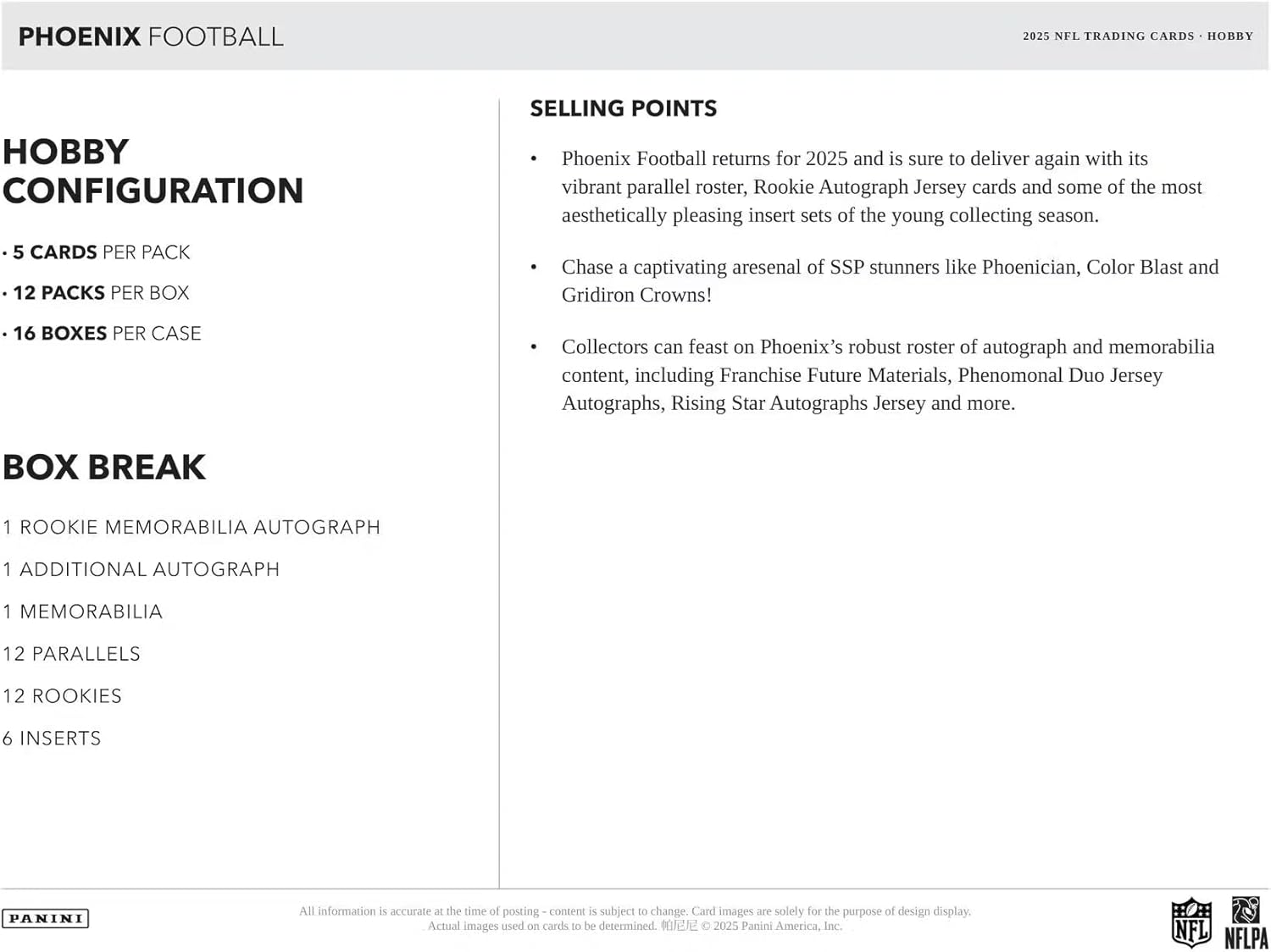 Panini 2025 Phoenix Football Hobby Trading Card Box (2 Autographs Per Box Including 1 Rookie Patch Autograph)