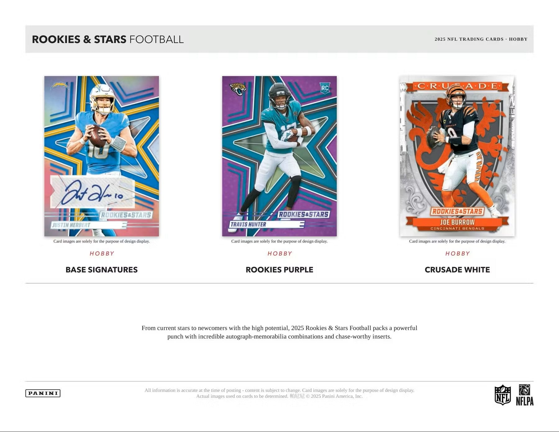 Rookies & Stars Football returns for the 2025 season, packing calling-card inserts, such as Crusade, Thrillers, Stellar Rookies, Autograph parallels and more!