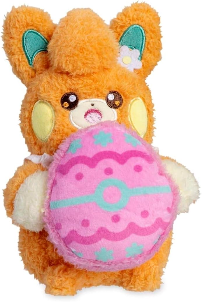 As fluffy as a spring lamb, this Pawmi Happy Spring Plush is here to welcome the season of flowers with joy! With a floral decoration by its ear and an egg-shaped macaron in its paws, the Mouse Pokémon brings sweetness to every day.