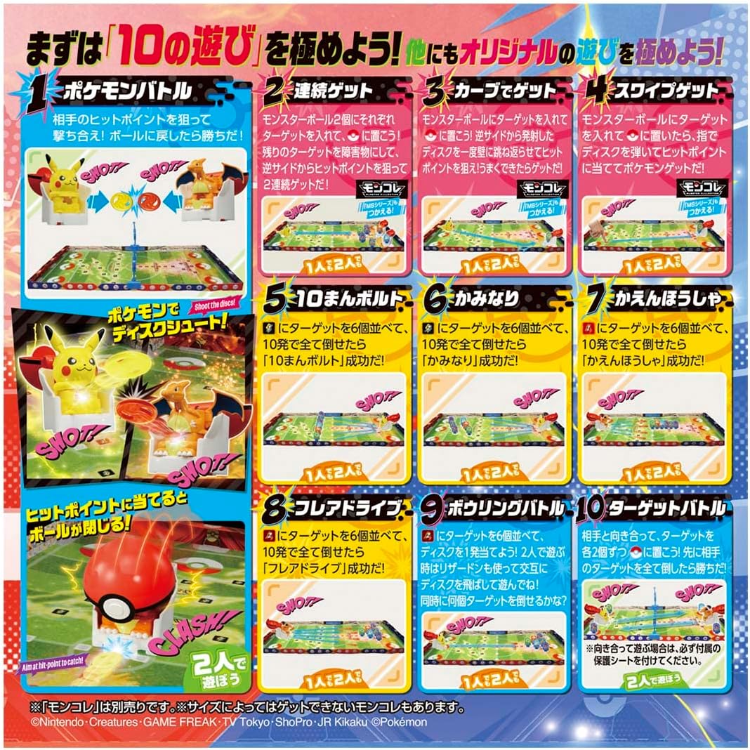 Set Contents: Pikachu (1), Charizard (1), Pokeball (2), Disc (Yellow) (10), Disc (10), Stadium (1), Protective Sheet (1), Post Parts A (2), Stake Parts B (2), Stake Parts C (2), Target Base (6), Target Mat Sheet (1), Seal (1), Unit Parts (Balance, Yellow) 1), Instruction manual (1). ), Spare Target Base (Yellow) (2), Spare Target Base (Red) (2),