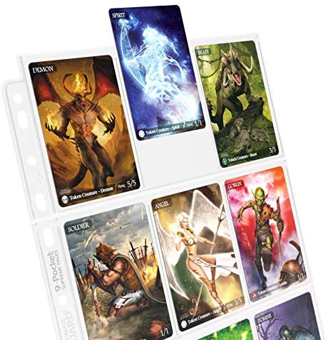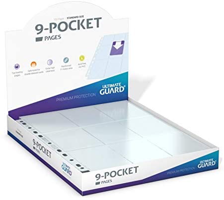 High-quality 9-pocket pages, that fit in almost any D-Ring-Binder, thanks to the double reinforced 11-hole strip. Each pack contains 100 pages for storing and carrying at least 900 double-sleeved cards (9 per page).