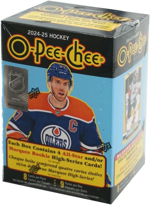 Configuration: 8 cards per pack. 9 packs per box. Hit Gallery & Product BreakdownHover over a card for more information BASE SET- Blue Border Parallel BASE SET – MARQUEE ROOKIES BASE SET RETRO VARIATION BASE ROOKIES Yellow Border Parallel BASE SET MARQUEE ROOKIES Red Border Parallel O-PEE-CHEE PREMIER O-Pee-Chee boasts a comprehensive 600-card base set which includes a 100-card high-series subset featuring only 2023-24 All-Stars and 2024-25 Marquee Rookies. Every box contains, on average, four (4) All-Star and/or Marquee Rookie cards! There are three (3) parallels of the complete base set, including a Blaster-exclusive Yellow Border parallel! Here is the parallel lineup: Blue Border: Collect one (1) per box, on average Red Border Yellow Border: Collect one (1) per pack, on average There is also the always-popular Retro Variation of the complete 600-card base set. Collect at least four (4) per box, on average! The O-Pee-Chee Premier set returns featuring many of the top veterans and rookies! PRODUCT BREAKDOWN Content, including the stated checklist #’ing, card #’ing and ratios, is subject to change without further notice. Additionally, this list may not contain all cards available in the product as there could be unannounced cards. Insert Cards Card #’ing/Ratio O-Pee-Chee Premier 1:12 Base Set Cards Card #’ing/Ratio Base Set (1-500) N/A Base Set All-Stars/Marquee Rookies (501-600) 1:2 Base Set - Blue Border Parallel 1:6 Base Set - Red Border Parallel 1:36 Base Set - Yellow Border Parallel (Blaster Exclusive!) 1:1 Base Set Retro Variation 1:2