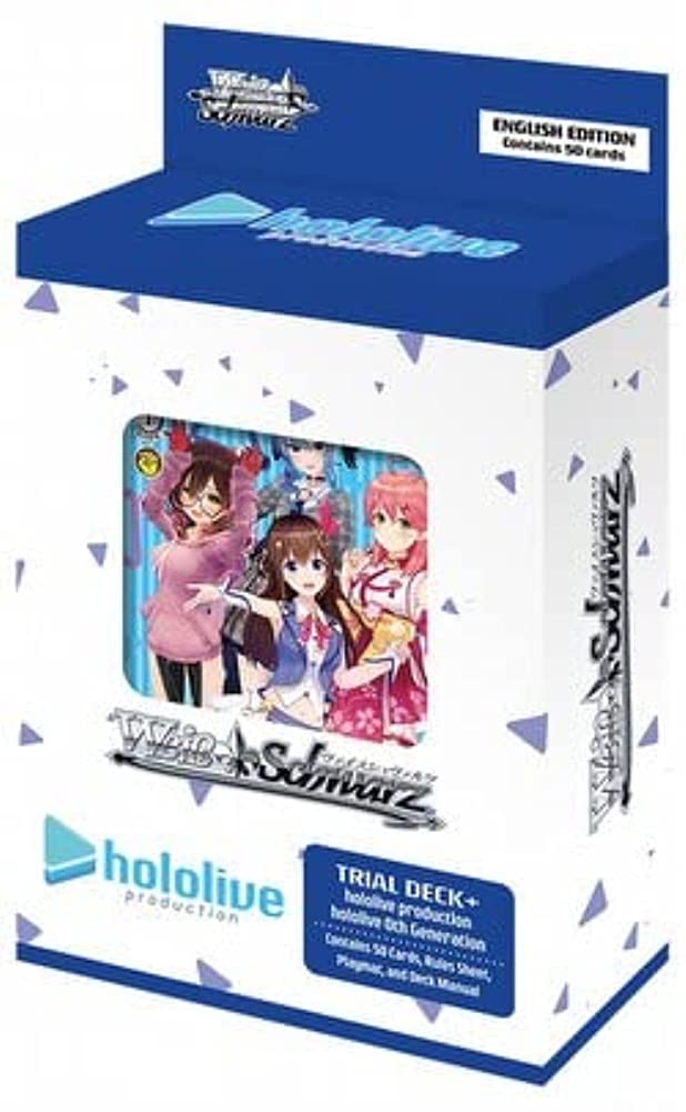 1 SR is in each deck.?Sign Card Information?There is also a RRR card or SP (Sign) card in each deck!- Tokino Sora- Robocosan- Sakura Miko- Hoshimachi SuiseiParallel CardsParallel cards are randomly sealed into decks!Every deck contains 1 SR + 1 RRR/SP!Every deck you purchase is to contain one of the following![RRR] Rare cards with special embossing (14 types)[SP] Sign card of talents (4 types)Products Specifications19 types of cards + 19 parallels50 Cards per Deck, 6 Decks per Display8 Displays per Carton?Rules Sheet, Playmat, and Deck Manual included?The contents of each deck (excluding parallel cards) are exactly the same.?Weiß Schwarz (English Edition) does not include gold/silver campaign coupon